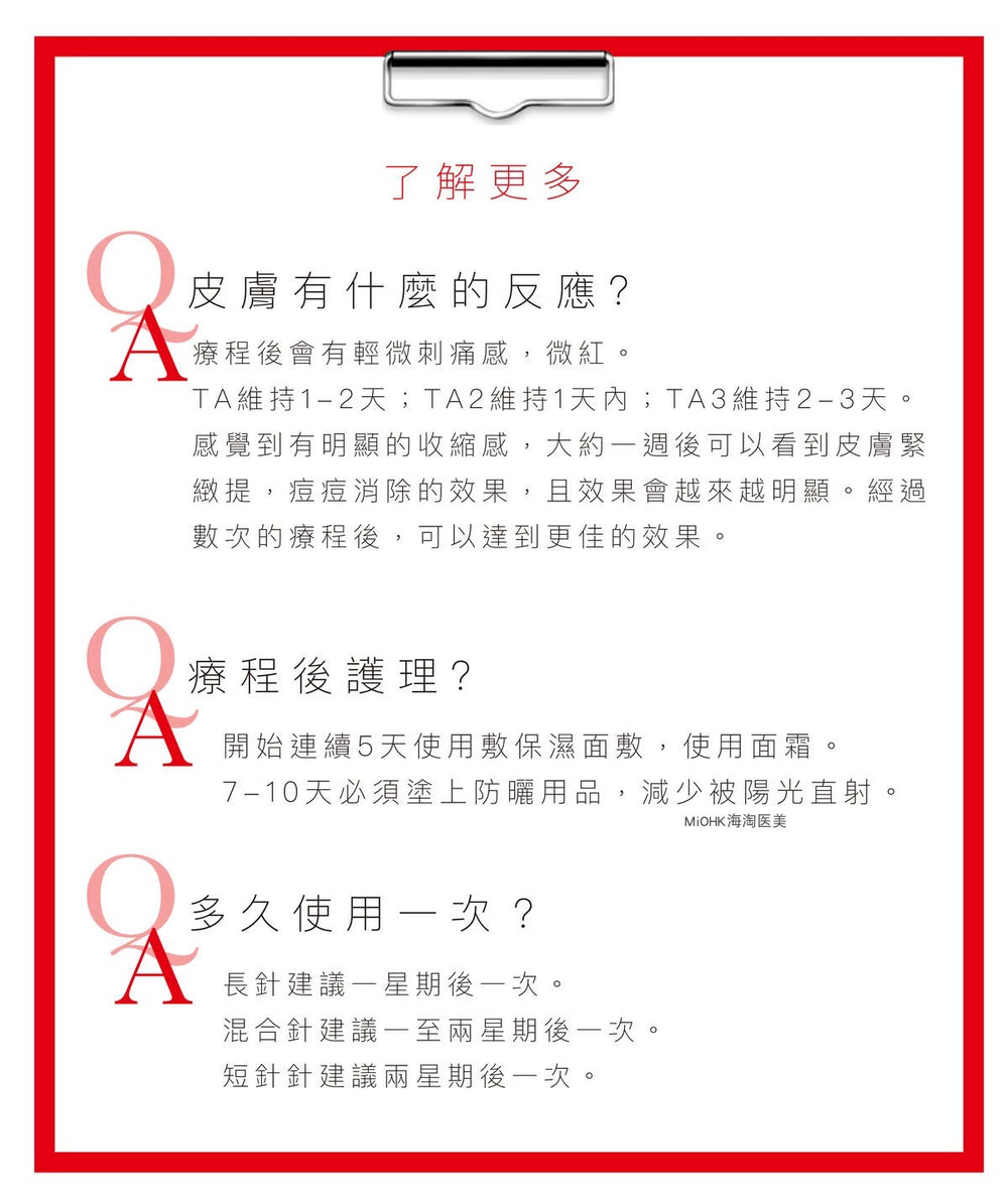 不同長度的矽針,能滲透皮膚不同位置,加多改善皮層層問題,解決粉刺黑頭形成,刺激膠原增生,達至面部提升減淡皺紋,收細毛孔的功效,同時去除老舊角質層,回復冗膚細緻光澤。
