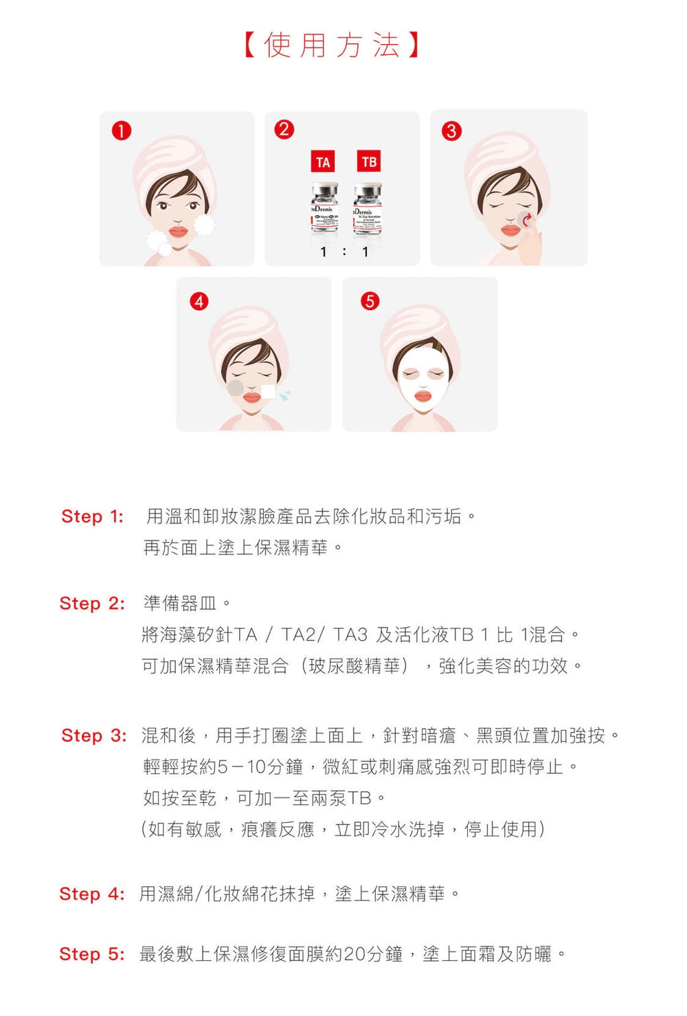 使用方法: 1. 清潔臉部 2. 將海藻矽針 Si-Tox-Powder (TA/TA2/TA3) 和海藻矽針活化液 Si-Tox-Solution (TB) 混合均勻後,以手指沾取混合後的海藻矽針抹於全面, 以小範圍局部繞圈圈輕力按摩3-10分鐘 (1g Si-Tox Powder 及5ml Si Tox Sol足夠使用兩次) 3. 全臉按摩後,再停留15-30分鐘讓海藻矽針完全滲透 4. 讓海藻矽針完全滲透後,就可以把臉上多餘的海藻矽針清洗 5. 建議敷上CO2 MASK/蠶絲面膜 ,靜待30分鐘,然後用攪棒刮下啫喱後,用清水清淨面部即可 - 矽針療程進行期間,停止使用A酸、果酸或高單位高濃度的藥品及保養品,一週內避免使用磨-砂、去角質產品 - 療程後應加強保濕和防曬 - 建議一星期左右進行一次,連續6次效果顯著