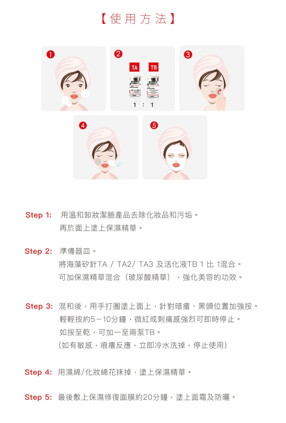 使用方法: 1. 清潔臉部 2. 將海藻矽針 Si-Tox-Powder (TA/TA2/TA3) 和海藻矽針活化液 Si-Tox-Solution (TB) 混合均勻後,以手指沾取混合後的海藻矽針抹於全面, 以小範圍局部繞圈圈輕力按摩3-10分鐘 (1g Si-Tox Powder 及5ml Si Tox Sol足夠使用兩次) 3. 全臉按摩後,再停留15-30分鐘讓海藻矽針完全滲透 4. 讓海藻矽針完全滲透後,就可以把臉上多餘的海藻矽針清洗 5. 建議敷上CO2 MASK/蠶絲面膜 ,靜待30分鐘,然後用攪棒刮下啫喱後,用清水清淨面部即可 - 矽針療程進行期間,停止使用A酸、果酸或高單位高濃度的藥品及保養品,一週內避免使用磨-砂、去角質產品 - 療程後應加強保濕和防曬 - 建議一星期左右進行一次,連續6次效果顯著