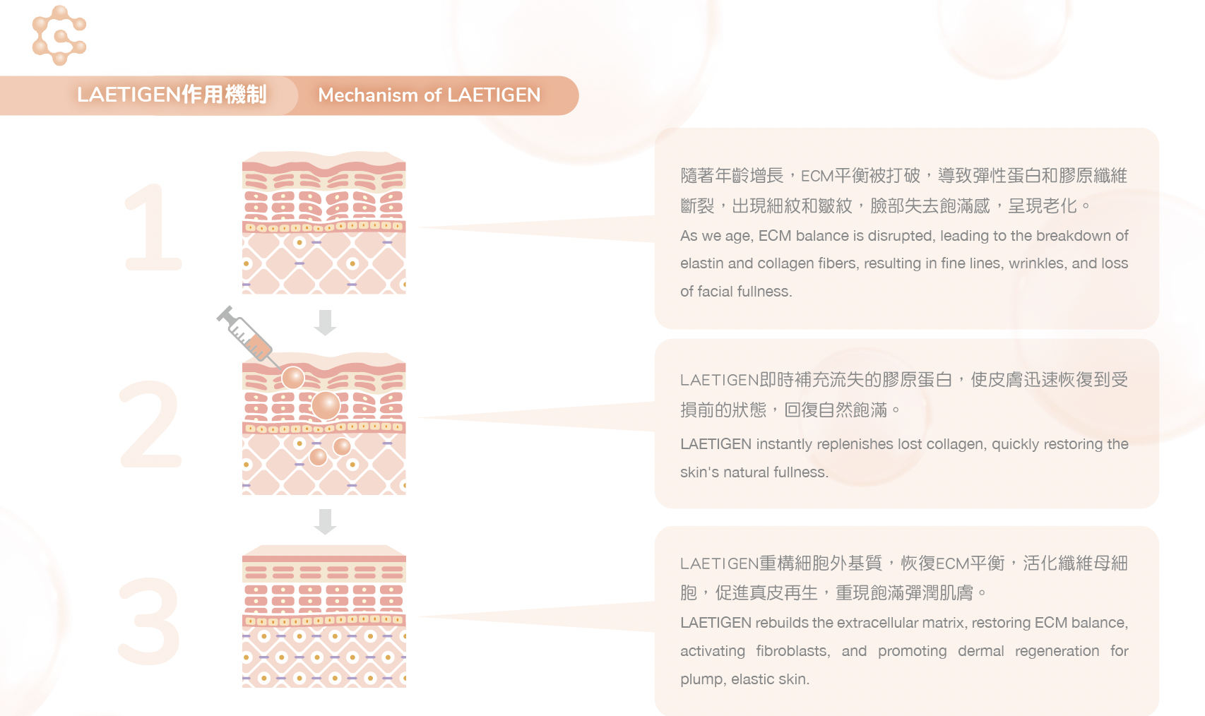 LAETIGEN® 珠珠針 透過直接補充真皮的主要成分1型膠原蛋白,提供肌膚再生所需的原料。健康的ECM對於維持正常的細胞結構和功能、維持肌膚結構緊緻和健康非常重要。