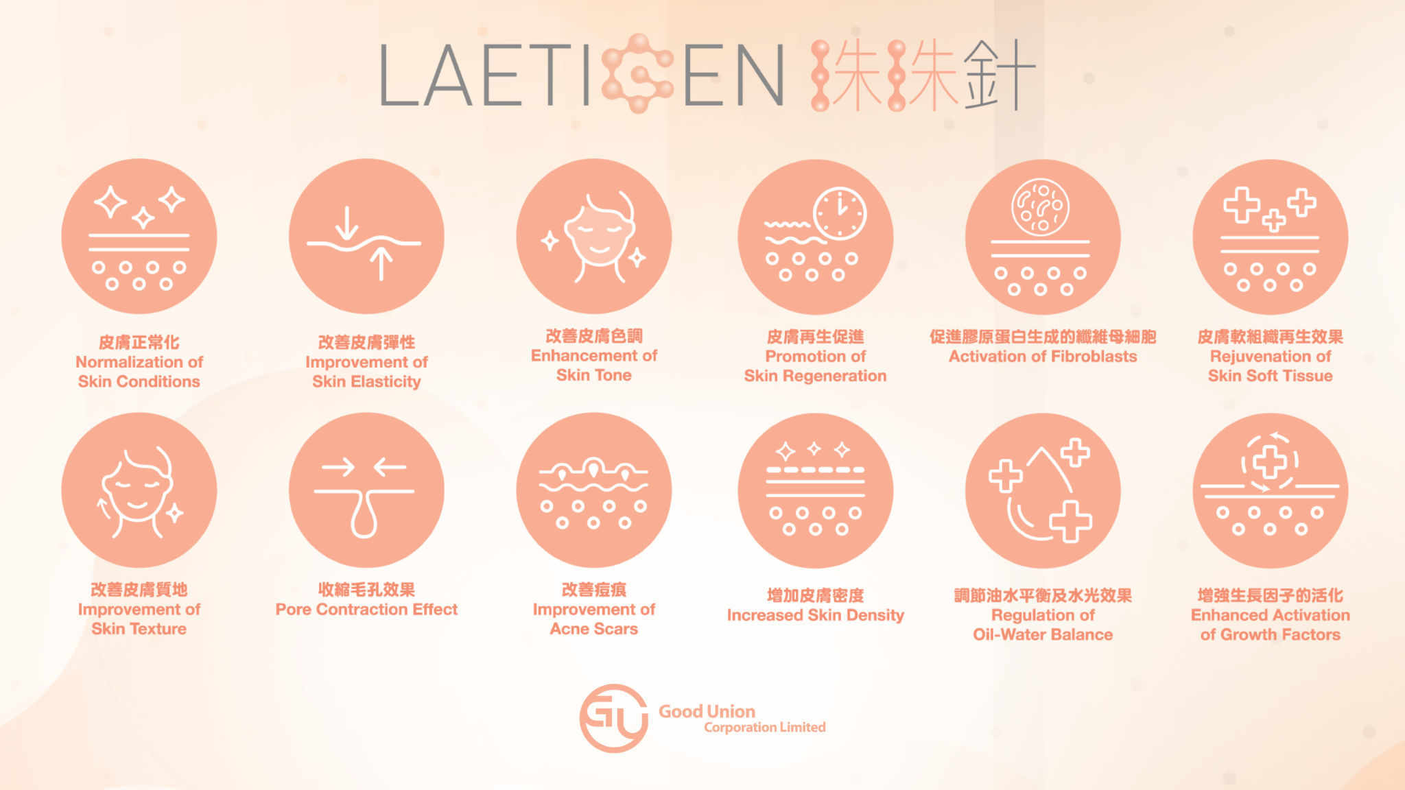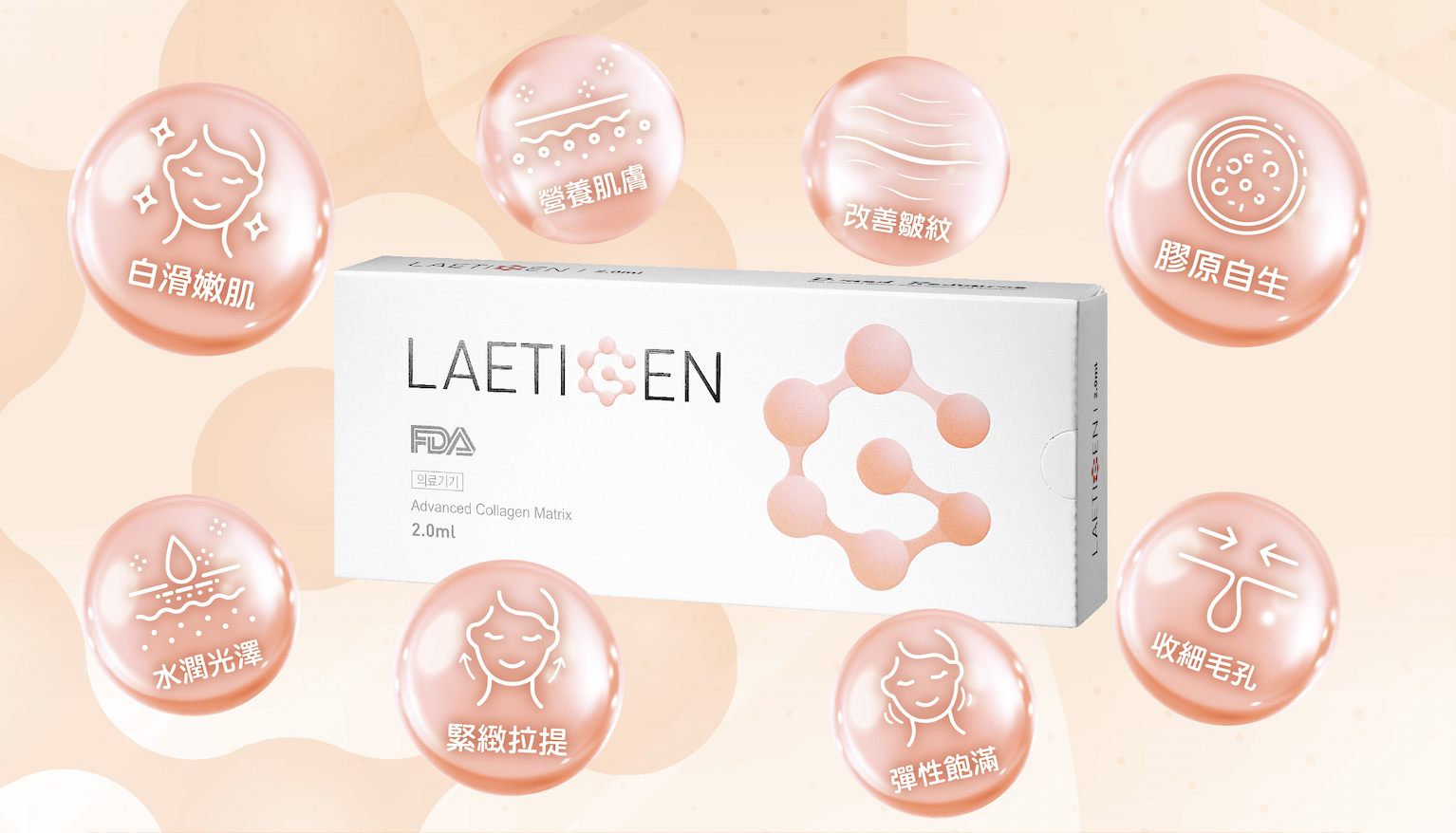 LAETIGEN® 珠珠針 是一種膠原蛋白植入劑,採用 FDA 認證的高純度1型膠原蛋白(在皮膚組織中起重要作用),與人體膠原99.9%吻合。在肌膚膠原蛋白流失中,注入 LAETIGEN® 珠珠針 可即時立即補充膠原蛋白,有助於解決老化問題,使鬆弛的皮膚恢復營養肌膚、水潤光澤、飽滿彈性、改善皺紋、收細毛孔、白滑嫩肌及活化細胞。